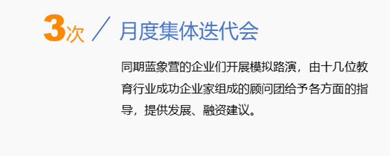 藍象資本是專注教育領域的早期基金,項目按照1000萬元估值投資30或80萬元。每年2期“藍象營”加速計劃,每期持續6個月。